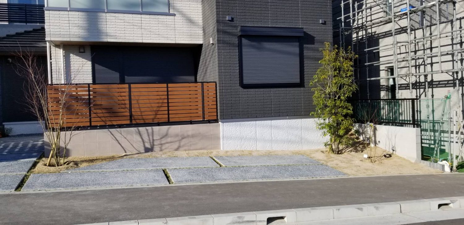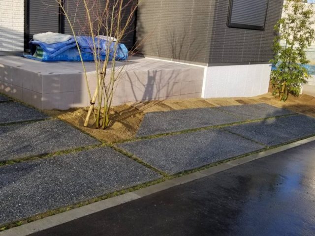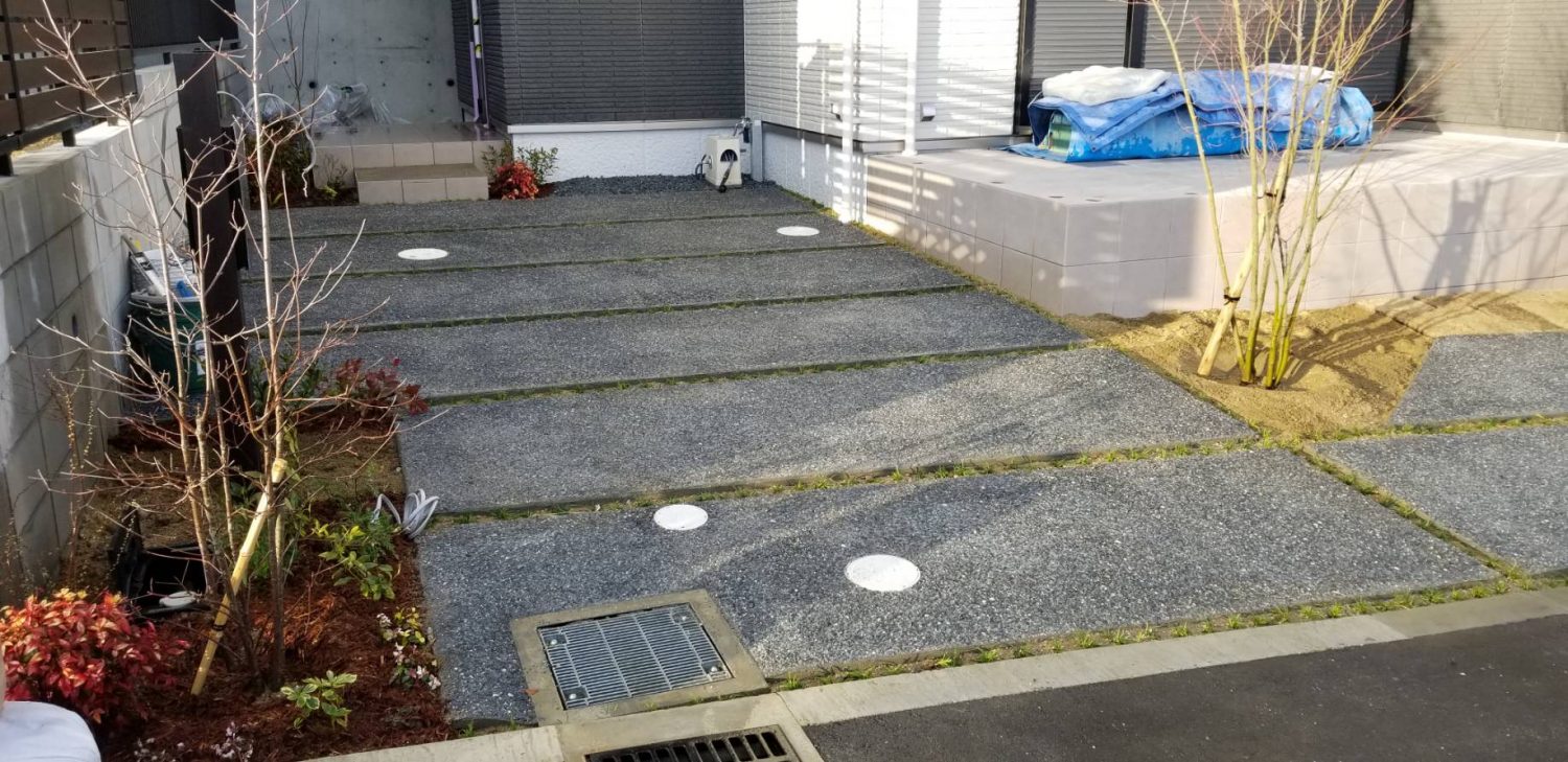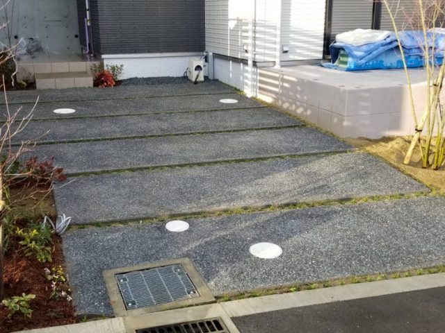 タイルデッキ、機能門柱、駐車場生コン洗い出しを行いました。